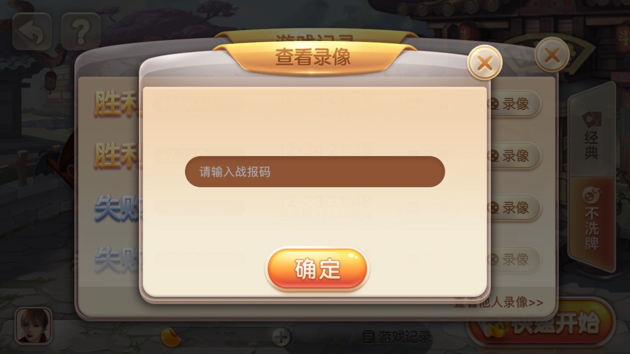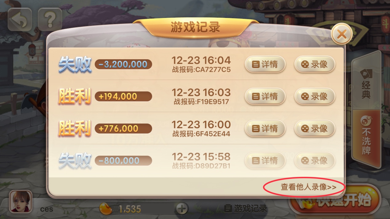进入850棋牌分类,点击《斗地主》,进入“经典玩法”或“不洗牌”,点击右下角的“游戏记录详情“——点击弹窗右下角文字链接“查看他人录像”——输入战报码,就可以查看他人的游戏录像了。无论你想向大神学习,还是回顾每一局对战,都可以通过上述方法找到录像。