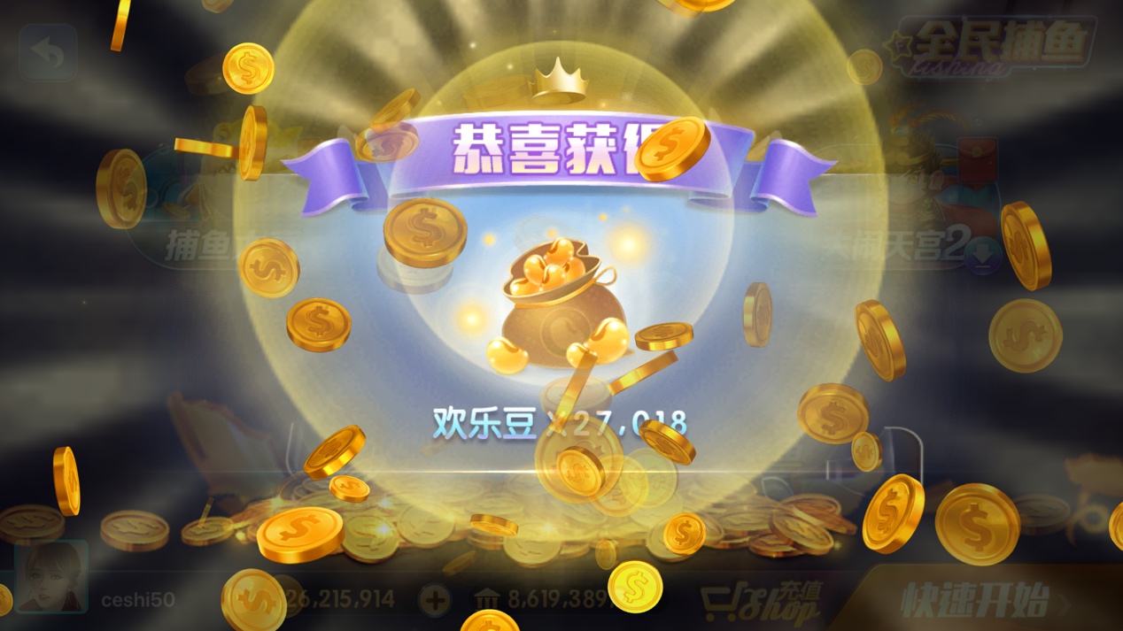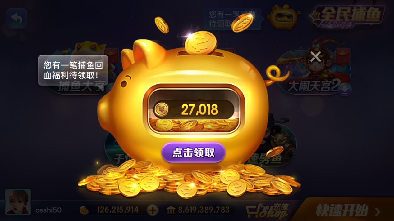 玩家在捕鱼游戏中消耗的金币,会按一定比例返还到金猪中。点击主界面的金猪图标即可开始砸金猪。捕鱼的场次越高,返还比例越高。当你发现小金猪出现的时候,轻轻一点可以砸出金豆,奖励将自动进入玩家银行。