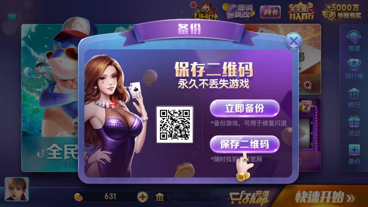 850首页——点击右下角“备份”——点击“保持二维码”,永久不不丢失游戏。